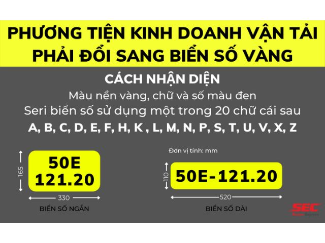 Biển số vàng được áp dụng cho các loại xe ô tô hoạt động kinh doanh vận tải, bao gồm xe khách, xe tải, xe buýt, xe chở hàng, và các loại phương tiện tương tự khác.