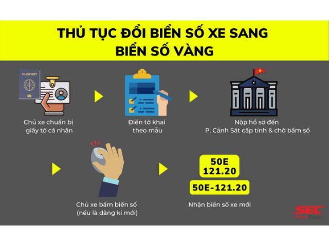 Để đổi biển số xe thành biển số vàng, bạn cần chuẩn bị các giấy tờ cần thiết và nộp hồ sơ tại cơ quan chức năng có thẩm quyền. Sau khi hoàn tất thủ tục và đóng lệ phí theo quy định, bạn sẽ nhận được biển số vàng mới.