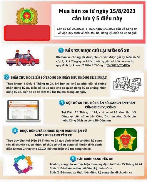 Khác với Thông tư 58/2020/TT-BCA trước đây, người dân khi bán xe sẽ kèm theo biển số và sử dụng biển của chủ cũ nếu cùng địa phương. Tại Thông tư 24/2023 quy định, khi bán xe, chủ xe phải giữ lại đăng ký, biển số, không được giao cho chủ mới của xe. Chủ cũ của xe phải nộp lại đăng ký, biển số cho công an để làm thủ tục thu hồi. Biển số này sẽ được cấp lại khi chủ xe đăng ký xe khác thuộc sở hữu của mình.